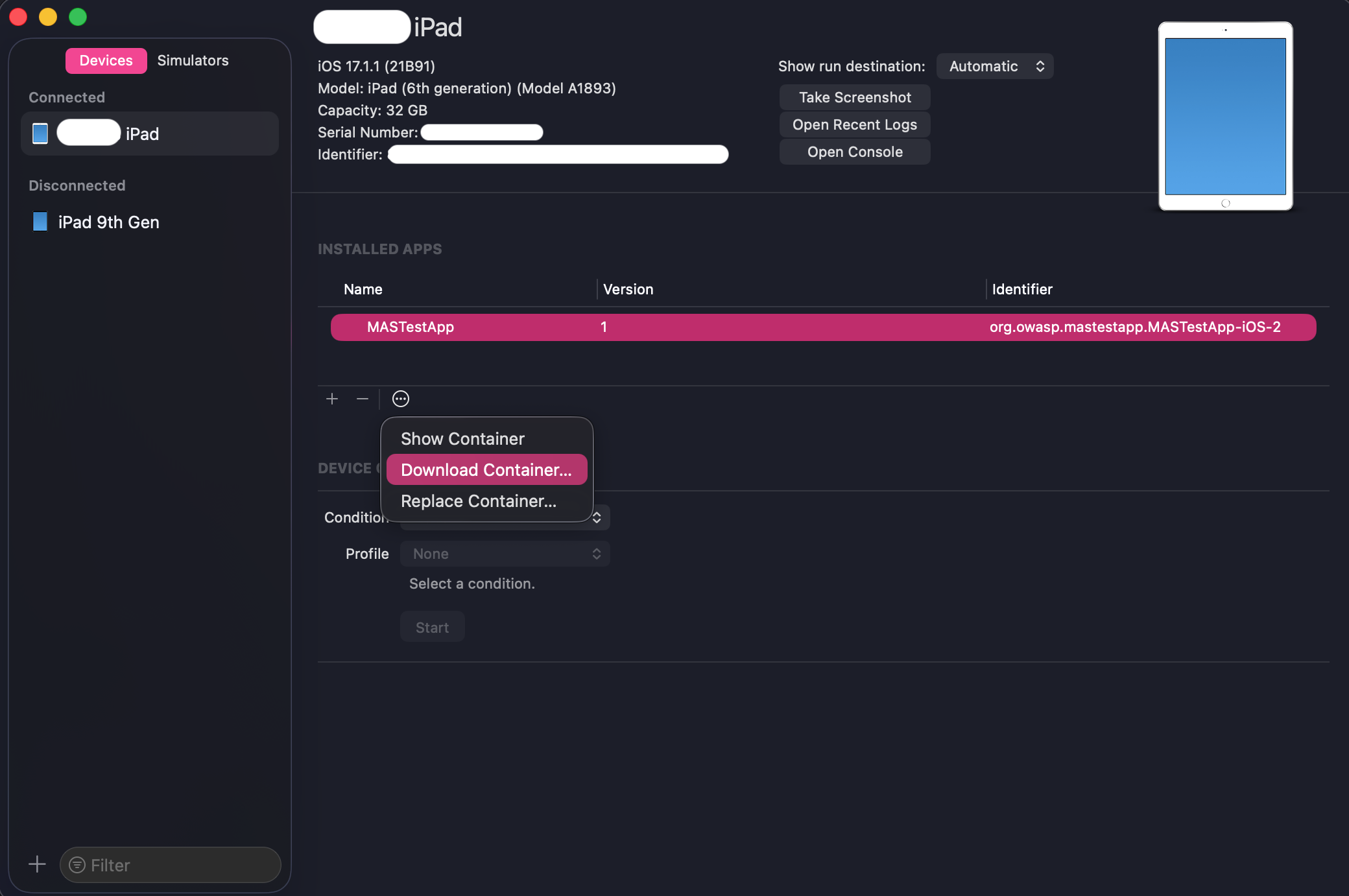 You can also use Xcode to download the app container directly from a connected device. This method only works for debug builds of the app.